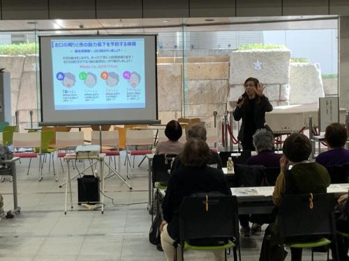 ・「8020運動」の紹介、正しい歯ブラシの持ち方やセルフケア(プラーク除去)のポイント指導。実践として、参加者全員での「唾液腺マッサージ」と「あいうべ体操」の実施をしました。